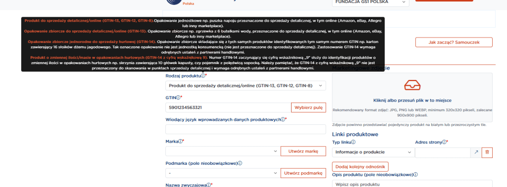 4. W polu Rodzaj produktu automatycznie ustawiony jest Produkt do sprzedaży detalicznej/online (GTIN-13, GTIN-12, GTIN-8). Nie musisz nic tu zmieniać: