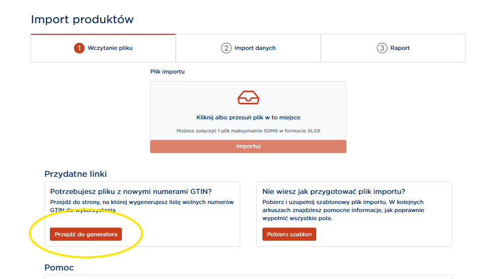 UWAGA! Jeśli widzisz raport z poprzedniego importu, wybierz Importuj kolejny plik, aby przejść do generatora wolnych numerów GTIN.