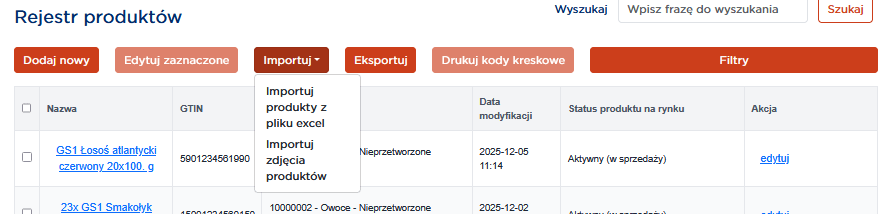 3. Wejdź w zakładkę Rejestr numerów > Rejestr produktów, a następnie Importuj > Importuj produkty z pliku excel.